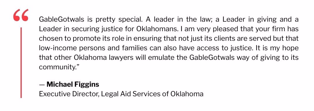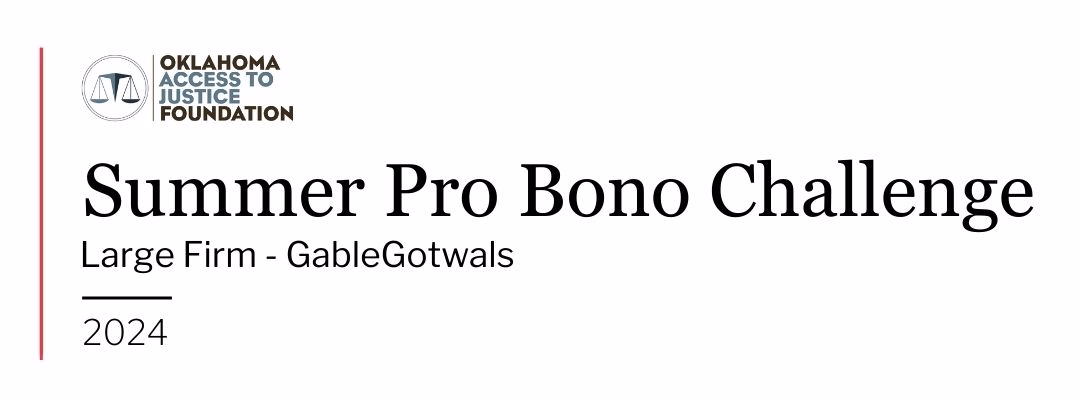 In addition to individual pro bono matters, the Firm partners with organizations such as Legal Aid Services of Oklahoma and CASA of Oklahoma to provide meaningful legal assistance to underserved communities. Each year, GableGotwals attorneys contribute both time and financial support to help expand access to justice across Oklahoma.